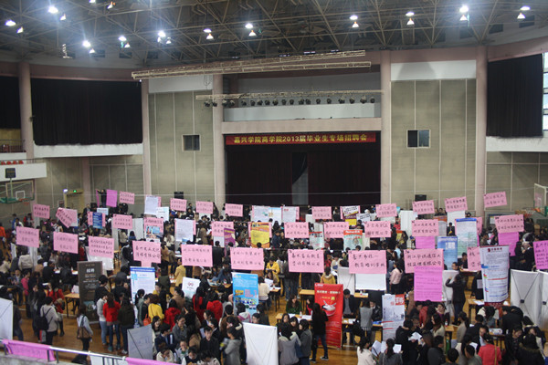 1117,91视频 联合南湖区人事局、团委举办的2013届毕业生专场招聘会在我校越秀校区体育馆如期举行。本次招聘也是91视频 作为二级分院集中组织的首场经管类专业大型招聘会,参会单位共计92家,除南湖区外,嘉兴秀洲区及所辖5个县市、上海、杭州、宁波、温州等地的单位也闻讯赶来,提供招聘岗位1300多个。