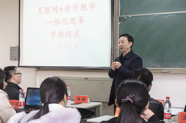 2017216日下午,互联网+会计教学一体化改革开班仪式在第一教学楼503教室隆重举行。中国会计学会副会长、中国会计教育专家委员会主任委员刘永泽教授、中国会计教育专家委员会秘书长杨政教授、正保远程教育集团高级副总裁刘温泉先生、正保远程教育教学服务部副总裁徐建宁女士、我校社会合作处处长袁志明、教务处副处长王敏、91视频 院长潘煜双、党委书记邵燕、副院长李郁明、副书记陈云飞,各系主任和会计、财务专业教师以及会计162163教改实验班全体学生参加了开班仪式。