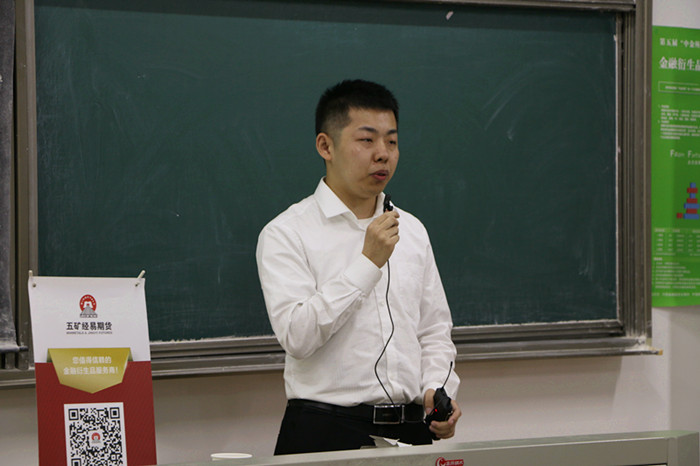 潘煜双致辞,欢迎五矿经易期货领导们的到来,同时鼓励同学们丰富课余生活,多参与课外知识竞赛,通过参加中金所杯金融知识竞赛等行业竞赛,检验自己掌握相关专业知识技能的水平。张天骄鼓励同学们注重自己综合素质的提升;刘禹含介绍了本届知识竞赛的规则以及要求。最后,曾获得第三届中金所杯知识竞赛特等奖(第一名)的优秀校友夏佳栋和同学们分享了他的比赛经验。通过宣讲会,更加激发了商院学子们参与竞赛的积极性。