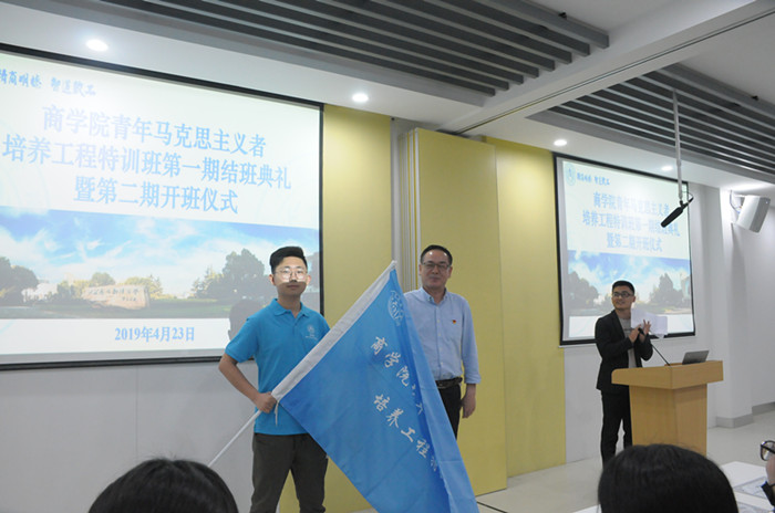 陈云飞为学院第二期青马班授班旗,张啸峰宣读了“91视频 团委关于准予李倩等首期青年马克思主义者培养工程特训班结业的决定”。与会老师为第一期学员颁发结业证书,为朋辈导师颁发聘书,并为学习中表现优异的小组赠送了图书资料。第一期学员代表高敏霞同学进行了学习经验分享,新一期学员代表杨子潇同学作了表态发言。