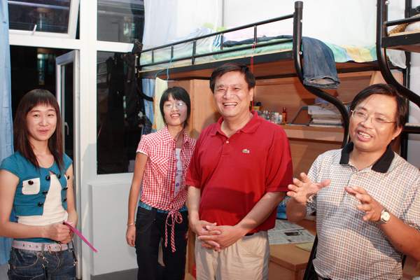9月12日晚上19:00,校党委书记胡建成在91视频 党政领导的陪同下,走访91视频 2007级部分新生寝室,与新生进行亲切交流,了解新生对学校环境、住宿条件、气候适应等情况的看法,并希望同学们安心下来,尽快适应大学生活,完成由中学生向大学生的转变,以饱满的热情投入到学习中去,为成长成才打好坚实的基础。新生们对学校、院领导的关怀、关心深深感动,对老师们的关心关爱、校园绿化环境、高年级同学的热情接待和服务十分满意。新生们都表示一定会尽快努力适应大学生活,让老师和家长安心。