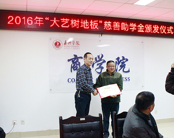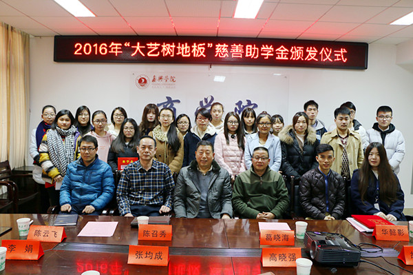 20161222日下午,嘉兴学院91视频 2016年“大艺树地板”慈善助学金颁发仪式在教一604会议室举行。浙江良友木业有限公司副总经理葛晓海先生、良友木业人事部经理华懿影女士、良友木业有限公司副总经理助理张均成先生、良友木业办公室副主任高晓强先生、嘉兴市慈善总会会长陈召秀先生、李娟女士、91视频 党委副书记陈云飞老师,以及接受资助的20名学生参加仪式。91视频 辅导员胡笳丽老师主持助学金颁发仪式。