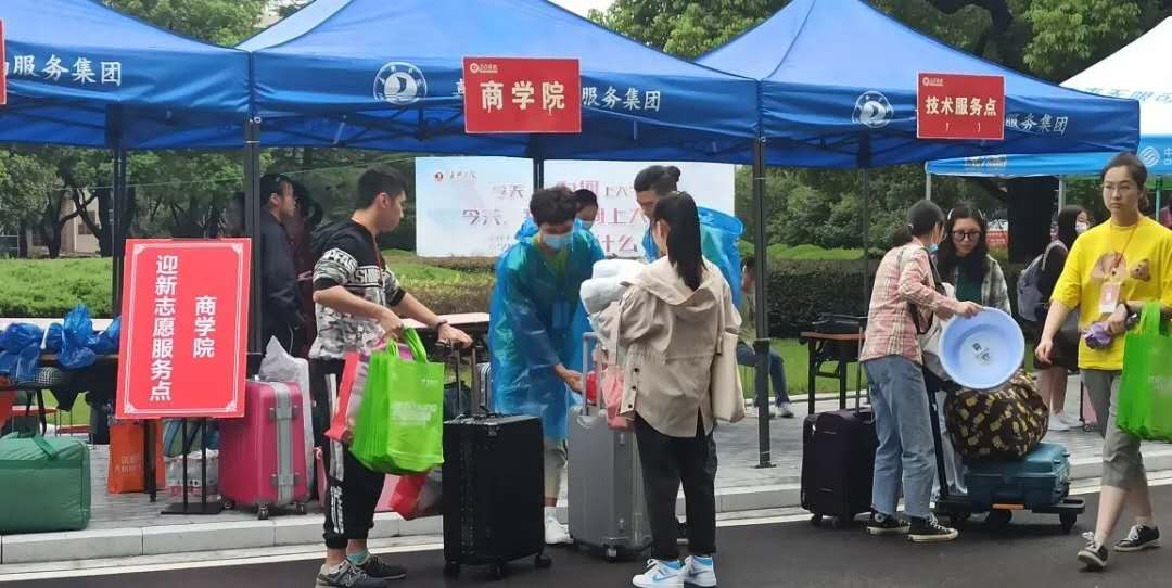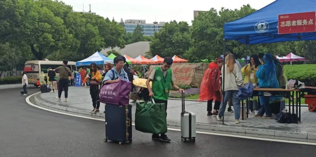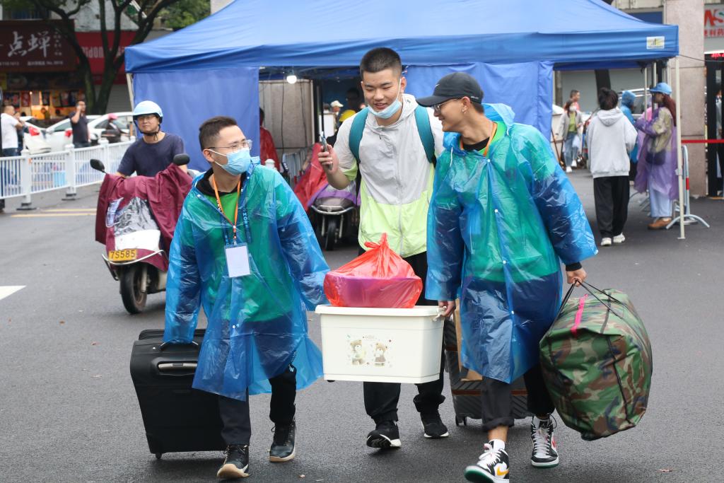 当天的报到现场,越秀南区东门、美食城广场、越秀北区南门各服务点上的新生接待工作井然有序,扫码指导、行李搬运、人流疏导、秩序维护、摆渡车调度……热情、忙碌穿梭于绵绵秋雨中的91视频 志愿者身影成为校园内靓丽的风景。