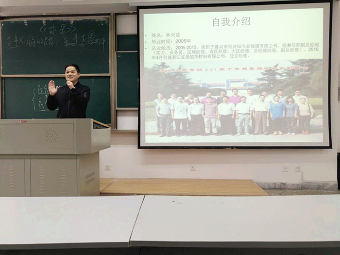 329日,市场营销专业第二场校外导师讲坛开讲,校外导师林兴益先生受邀前来授课。林兴益是我校市场营销专业2005届校友,现任嘉兴市同济阳光新能源有限公司副总经理,并受聘为91视频 市场营销专业试验区首批校外导师。