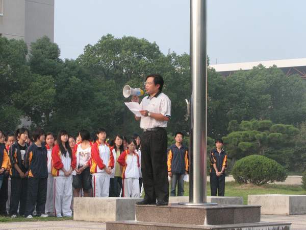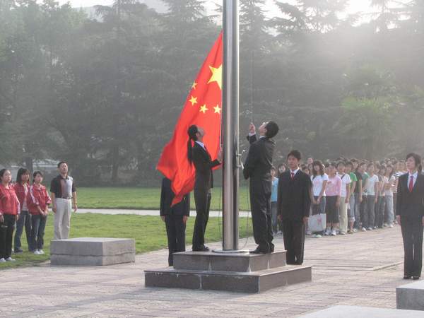 7时5分,升旗仪式正式开始。由5名学生组成的国旗护卫队,服装统一,精神抖擞而庄重地护卫着国旗走向升旗仪式典礼台。在庄严的国歌声中,鲜艳的五星红旗冉冉升起,全体师生肃然起敬,行注目礼。