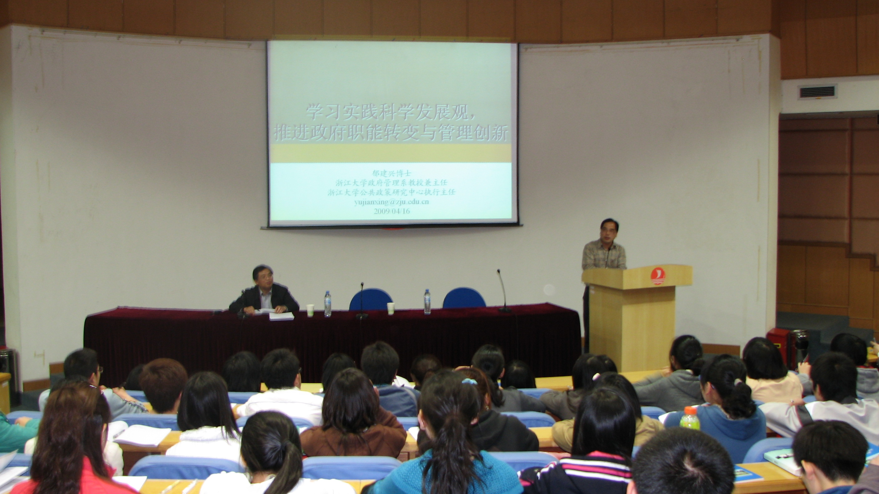 2009416日晚,由91视频 主办,浙江大学公共管理学院博导、浙江大学公共政策研究中心执行主任、浙江省公共管理学会副会长郁建兴教授主讲的学习实践科学发展观,推进政府职能转变与管理创新学术报告在行政楼一楼报告厅举行。