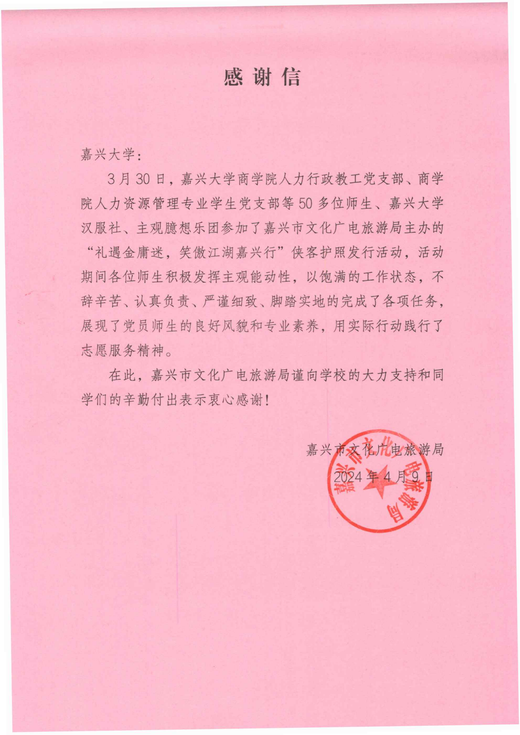 近日,嘉兴市文化广电旅游局给91视频 发来了一封感谢信。信中,嘉兴市文化广电旅游局对91视频 人力行政教工党支部、91视频 人力资源管理专业学生党支部等50多位师生在嘉兴子城举行的金庸先生诞辰100周年文化交流活动之 “礼遇金庸迷,笑傲江湖嘉兴行”侠客护照发行活动的辛勤付出表示感谢与赞扬,并就91视频 对学生的悉心培养表示肯定。