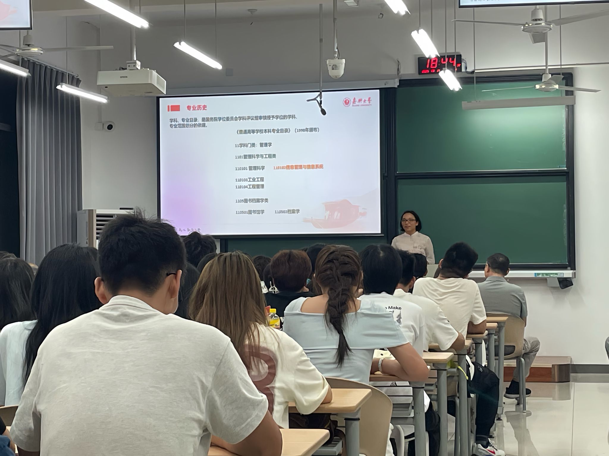 “教授说专业”环节,由信管教研室主任张细香教授进行专题讲解。她从专业历史、学科特点、培养目标、核心课程等方面入手,系统阐释专业价值内涵与学习路径。张教授不仅讲解“学什么”,更深入剖析“为什么学”与“未来如何用”。展望未来发展,她指出,高级人才成长融合技术素质与管理素质,希望同学们在掌握扎实专业技能的同时,注重培养时间管理与知识管理综合能力,努力成为适应数字时代需求的复合型人才。