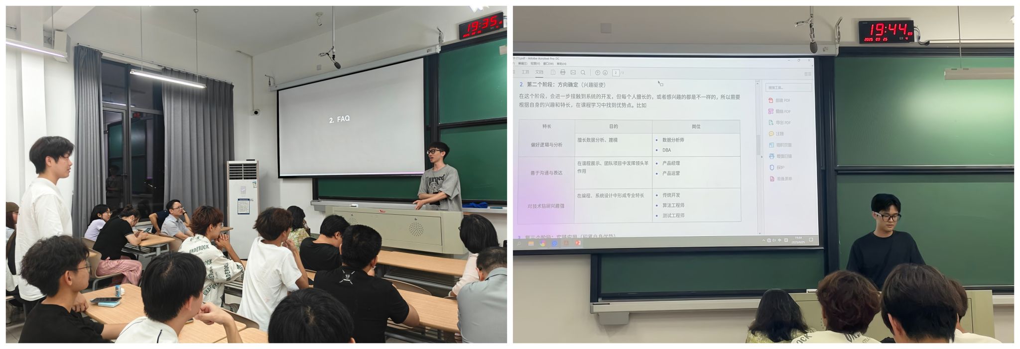 “校友经验分享”环节,会议邀请两位国内头部互联网大厂的前端技术及后端开发专家吴敬昌和洪晨。吴敬昌强调,专业能力筑就职场底层核心,这不仅要注重经济学与管理学思维的培养、明确任务价值,还要不断拓展技术广度与深度。洪晨则建议同学们沿着“基础学习-方向定位-实践应用”路线构建专业能力,以兴趣为导向,把握专业分流与学科竞赛等关键节点。学长们现身说法,为新生提供了极具参考价值的学习范本。