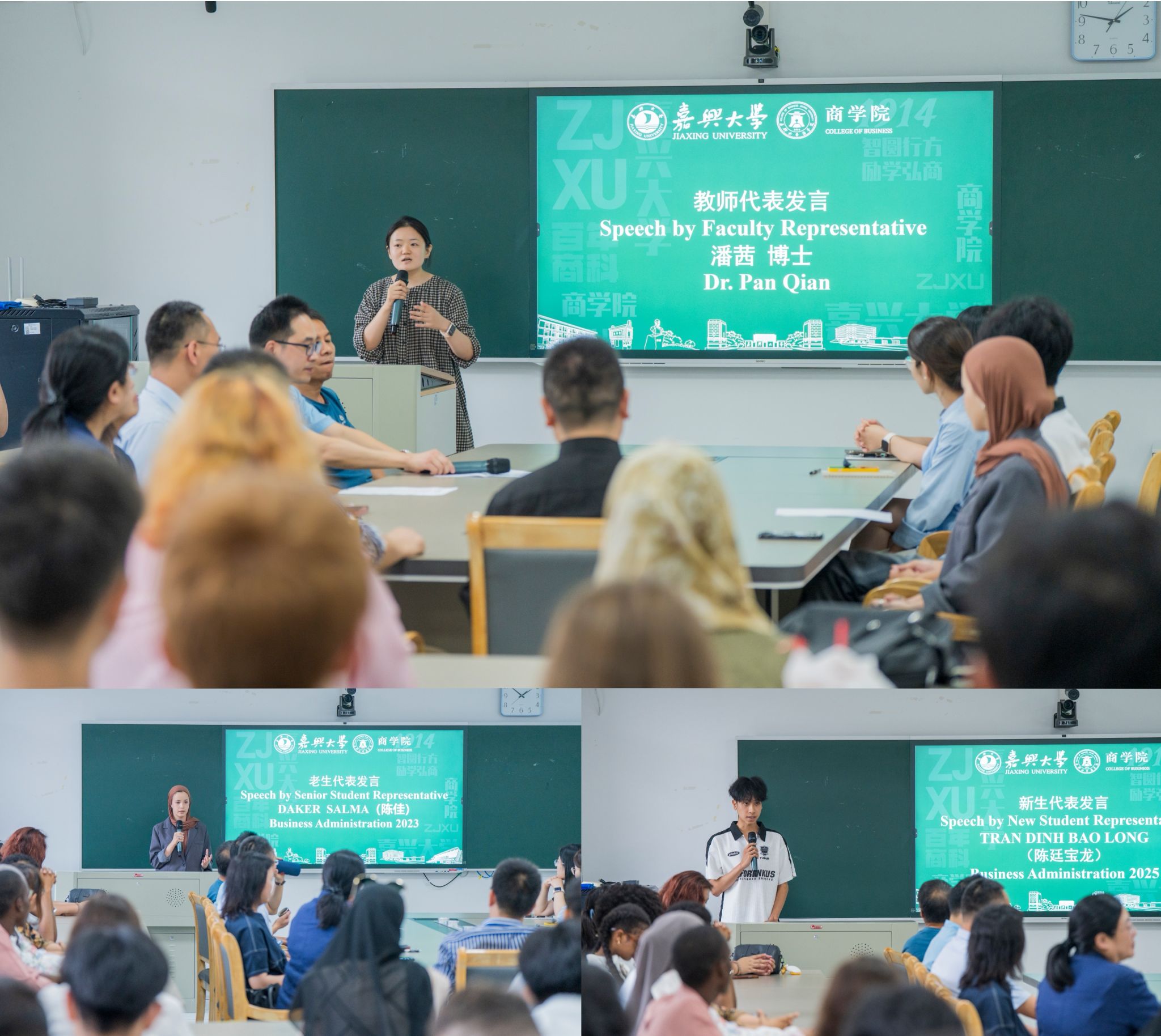 随后,工商管理系教师代表潘茜博士、2023级老生代表DAKER SALMA以及2025级新生代表陈廷宝龙分别发言。潘茜博士代表教师向新生表示热烈欢迎,并鼓励大家保持好奇心与学习热情;DAKER SALMA分享了在91视频 学习生活的收获与感悟;陈廷宝龙代表新生表达了对未来学习生活的期待与信心。