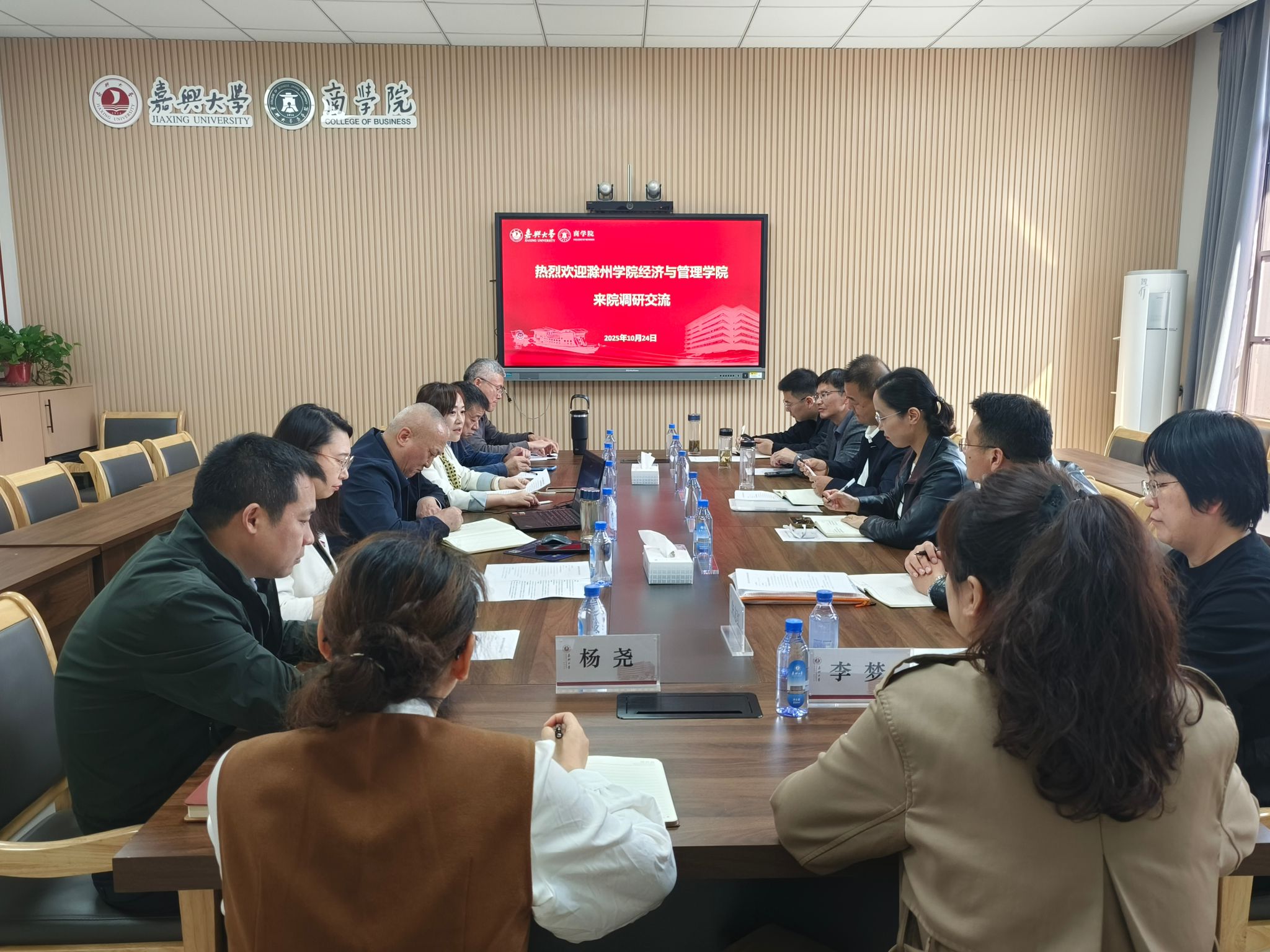 1024午,滁州学院经济管理学院党委书记张悦、院长王琦一行来91视频 调研交流。91视频 院长李勇、党委书记虞岚、学术副院长智佳宁及相关负责人参加交流座谈。会议由李勇主持。