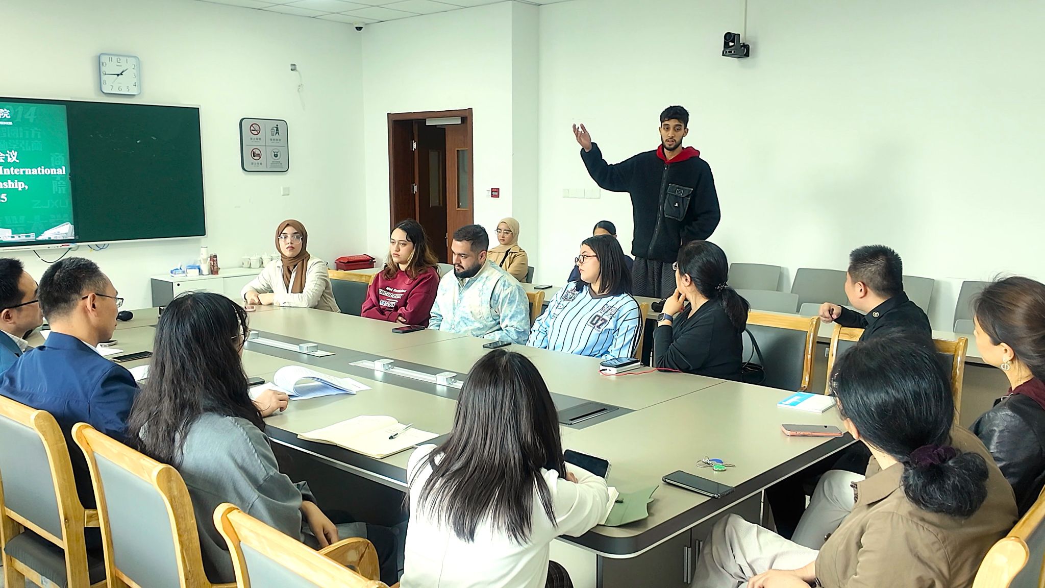 在交流环节中,每位2022级工商管理专业国际生依次介绍了自己即将开展实习的企业和岗位,汇报了准备情况,并郑重表态—将严格遵守学校与企业的安全要求,在实习中展现91视频 首届国际生的良好风貌。