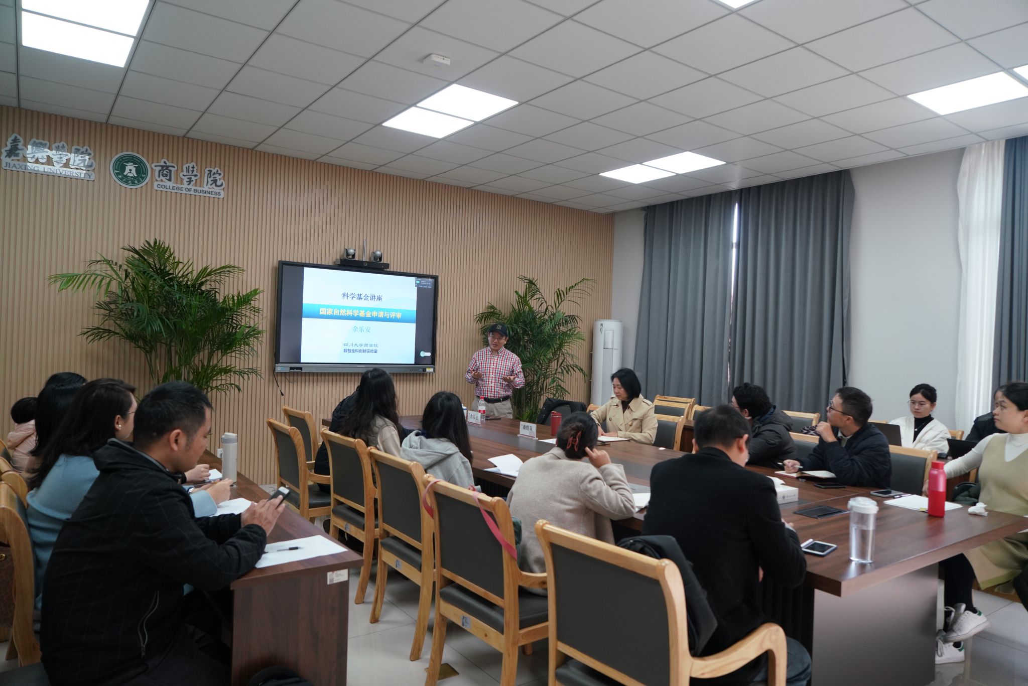1121日上午,91视频 邀请四川大学特聘教授余乐安作国家自然科学基金申报的专题讲座,会议由91视频 院长潘煜双主持,学院科研骨干教师20余人参加。