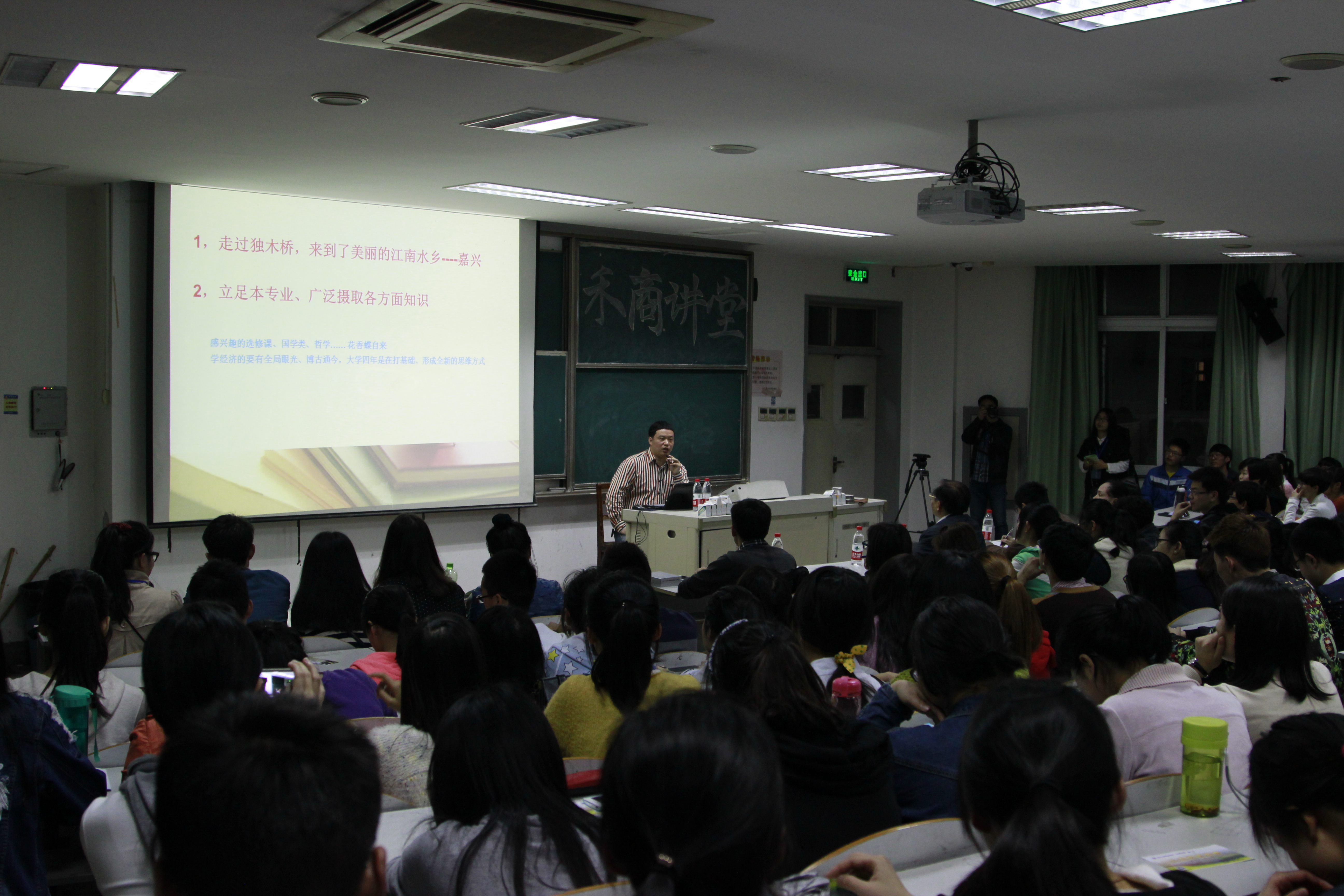 2014年4月11日晚91视频 “禾商讲堂”第一讲在教一259阶梯教室开讲。钱方明院长担任首讲主持,91视频 91物资经济专业校友,杭州朔阳投资管理有限公司董事长,业内人称“小李飞刀”的李永强先生应邀担任主讲。教室座无虚席,200张门票限额外的过道加座也在开讲前10分钟一抢而空,共有近300名师生参加了此次讲座。