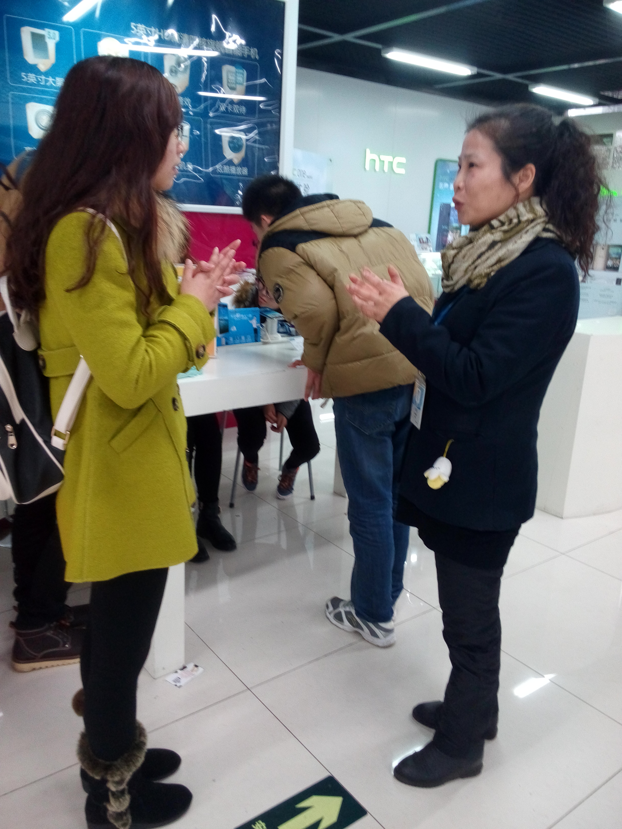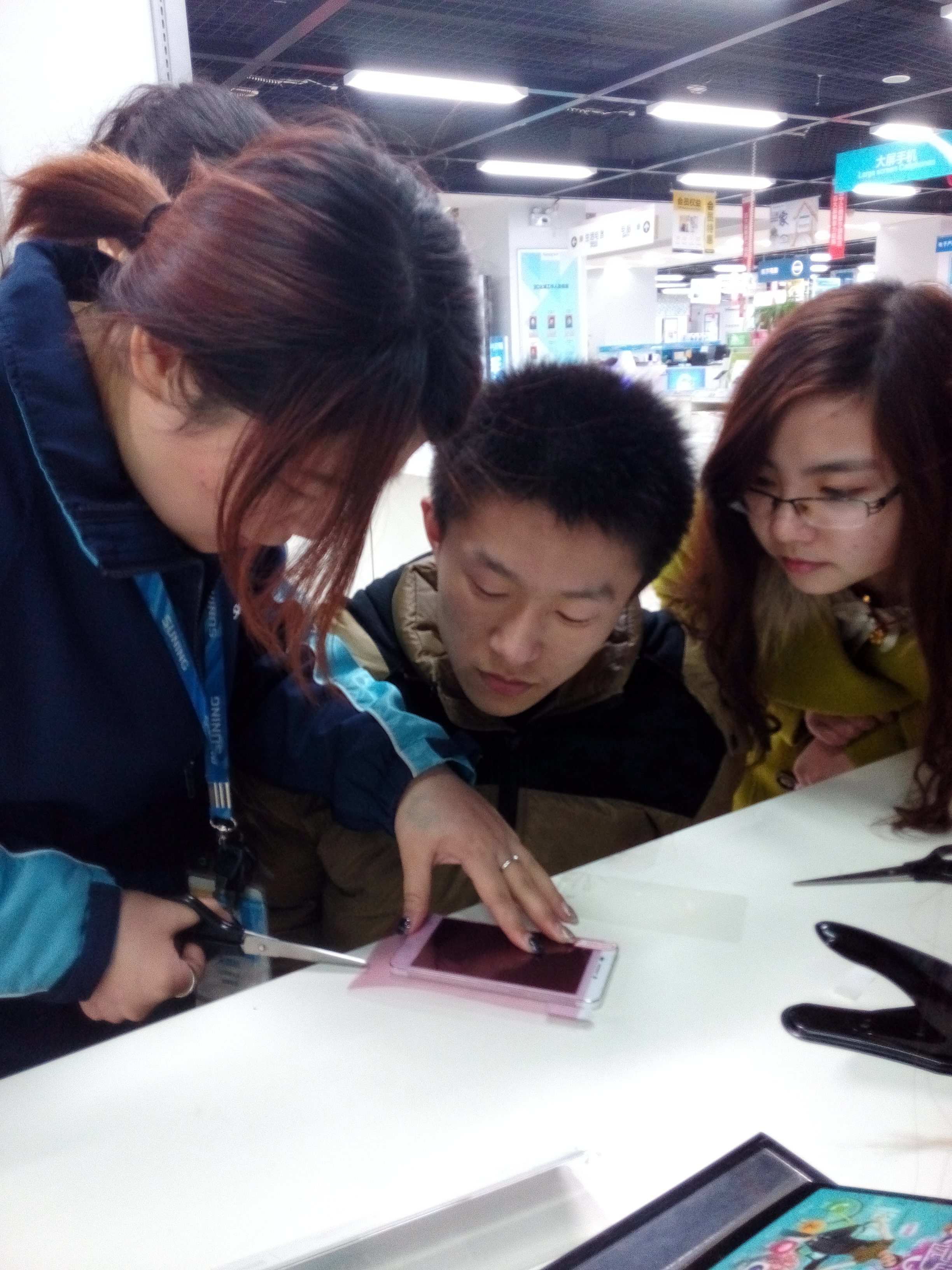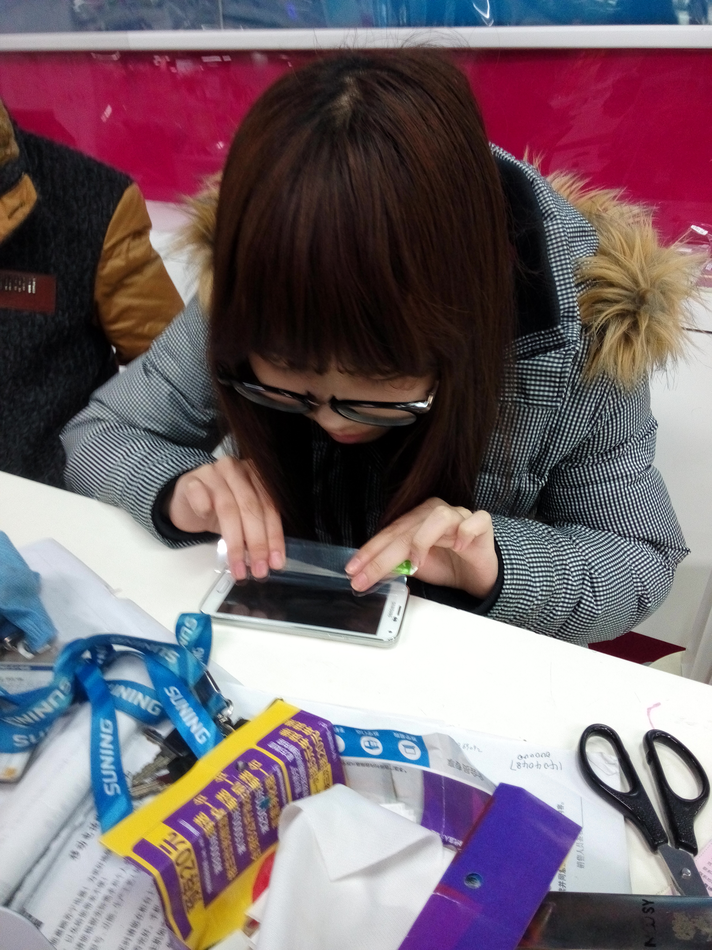 下午2点,91视频 志愿者们到达江南摩尔区的苏宁易购企业与相关负责人进行洽谈,了解了企业的规模和发展方向,也向企业介绍了91视频 的志愿活动开展情况和计划。随后,志愿者向企业人员学习了手机贴膜技术,为即将合作“雷锋免费贴膜”的志愿服务项目做准备。起初几位志愿者并不熟悉贴膜技巧,多次反复练习后最终掌握贴膜基本要领。企业人员也表示希望今后有更多的合作和为学生服务的机会。