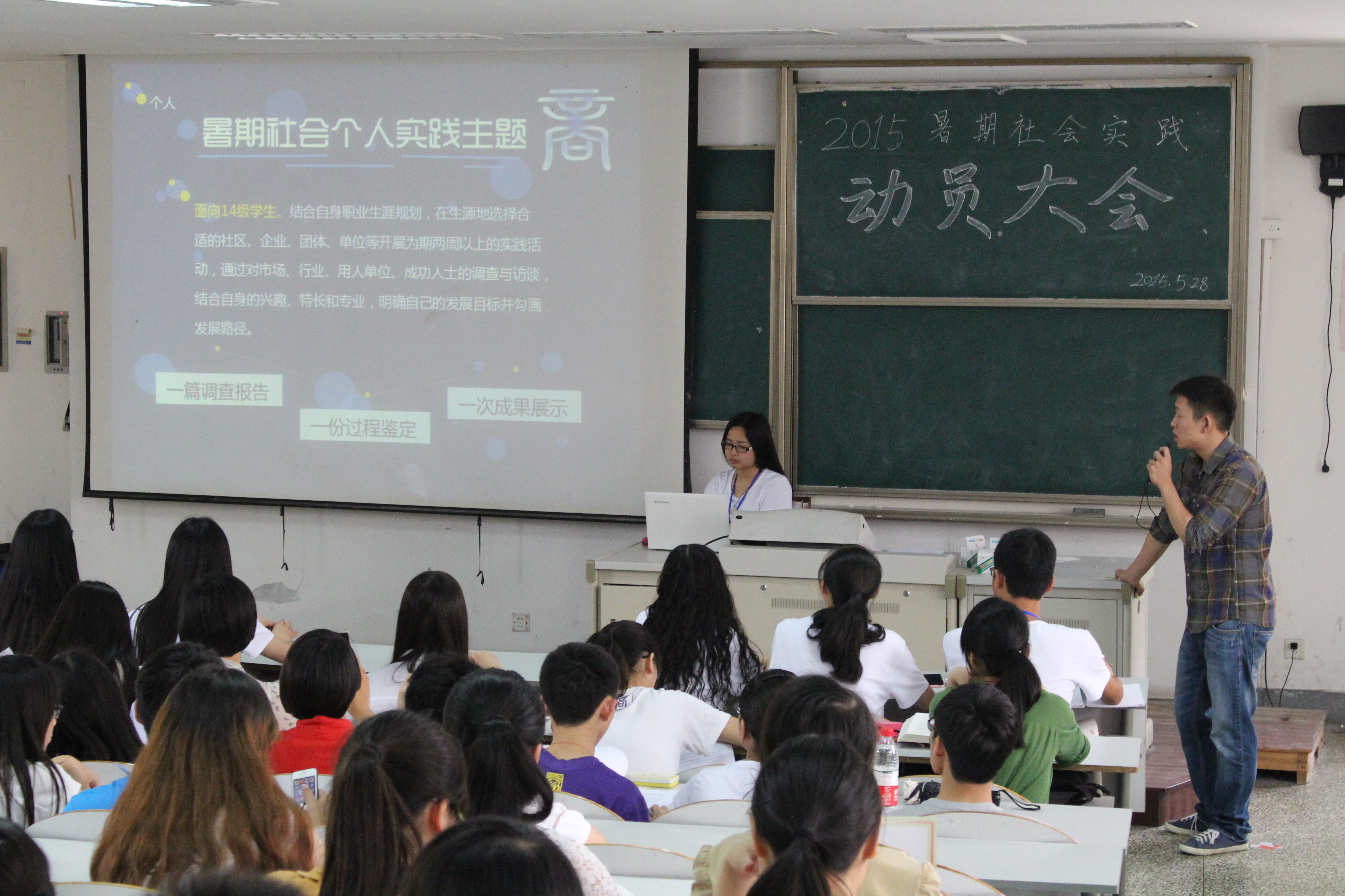 会上,刘俊同学介绍了2015年暑期社会实践的概况和申报流程,并就相关组织工作进行了部署。2014年省级先进集体——中小企业融资实践调研团代表余佳琴同学分享了经验和收获,强调实践开展中的注意事项。最后,学院团委书记潘欣老师做了总结,指导项目式团队实践的选题和主题式分散实践的方向,鼓励同学整合资源,结合兴趣、专业、热点和科研项目开展实践,在最美的年华做有意义的事。