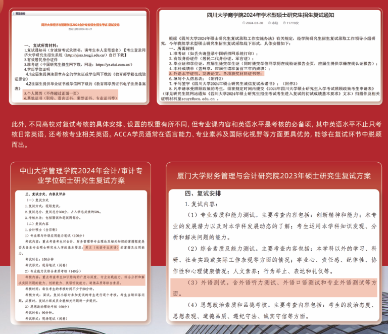 复试资格审查是考研复试前的必要程序,用于确认考生是否符合报考条件和复试要求。重点高校在资格审查中不仅关注基本条件,还会将相关专业资质证书纳入考查范围。因此,ACCA作为具备国际认可度的高含金量证书,在考研复试中常被视为专业素养和综合能力的体现,能够为考生增添显著优势。