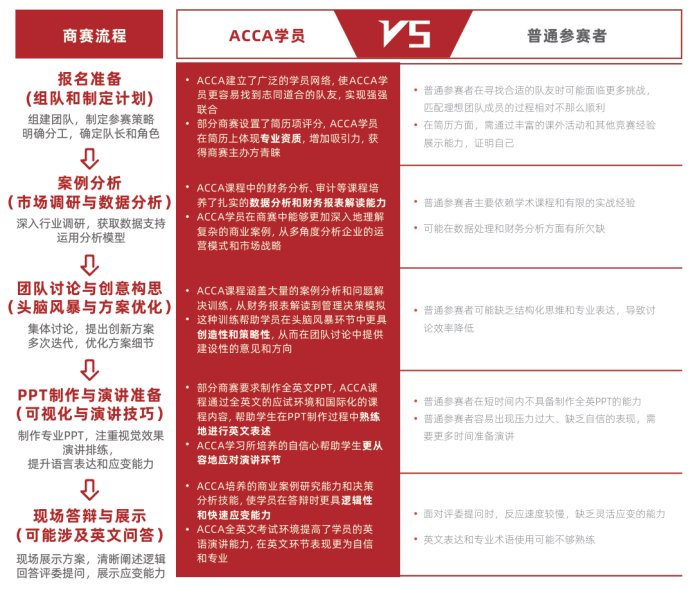 ACCA知识架构中财务分析能力、数据呈现、商业模型使用和综合战略的思维方面,帮助大学生有更 突出的表现。商业比赛是帮助大学生获得一份好实习的重要途径,写进简历中的重要经历。