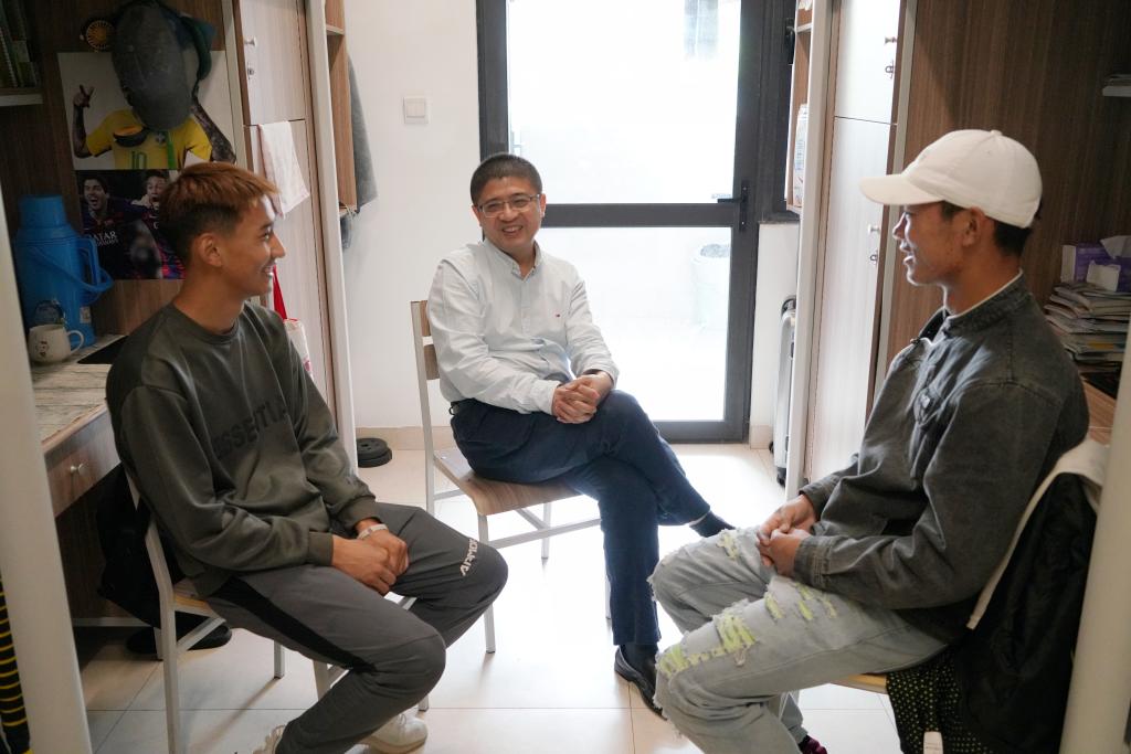 在结对学生寝室,陈荣达与同学们亲切交谈,详细了解结对寝室同学在校期间的学习生活情况,业余时间安排。在得知扎西曲旦和贡久旦增两位同学目前对数学、英语学习存在困难,课余又十分热爱足球运动时,他鼓励同学们要保持对运动的热爱,并且要能够将对足球运动的耐心和韧性运用到学习中,发挥体育精神,善于发现思考问题,做到多学、勤思、好问,进一步提高自己对知识的理解和学习能力。他希望,藏族同学在校期间一方面要扎实专业学习、拓展知识面,注重做好自身短期、长期规划;另一方面还要利用求学机会,不断发掘自身潜力,为将来个人发展做好铺垫、为今后奉献家乡建设打好基础。