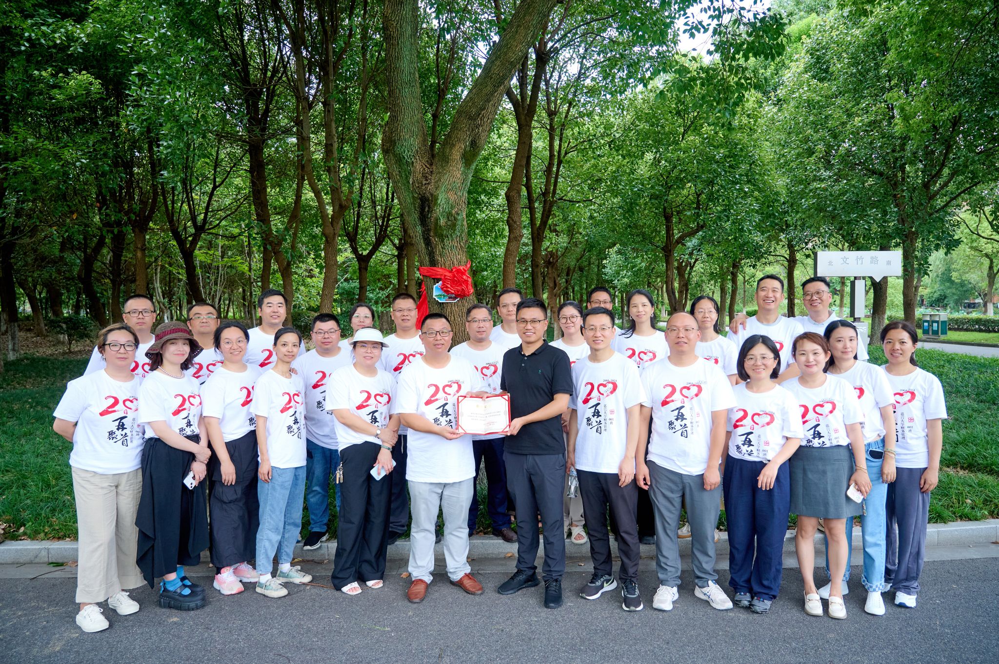 随后,校友们前往郁郁葱葱的校友林为财务001班校友树挂牌,这棵纪念树不仅见证了校友们对母校的深情厚谊,更寓意着校友们与母校之间的深厚情谊将如树木般茁壮成长、枝繁叶茂。