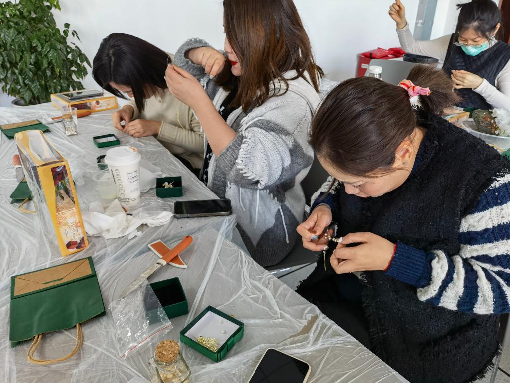 3月8日下午,全院女教工欢聚在尚德楼311进行珍珠手工制作活动。活动指导老师先为大家详细讲解了珍珠的产生、品种、真伪辨别、如何保养、如何品鉴等知识。随后,老师为大家演示了开蚌的具体操作流程和注意事项。老师话音刚落,大家便迫不及待地操刀亲手开蚌取珍珠。每一个蚌就像一个盲盒,里面都藏着满满的惊喜,取出的珍珠色彩多样,形态各异。活动现场惊喜的欢呼声和赞叹声此起彼伏。接着,大家将取出的珍珠仔细清洗,反复擦拭,精挑细选出最喜爱的那颗珍珠镶嵌在饰品拖上。随着一个个精美的饰品新鲜出炉,大家如获至宝,喜不胜收。
