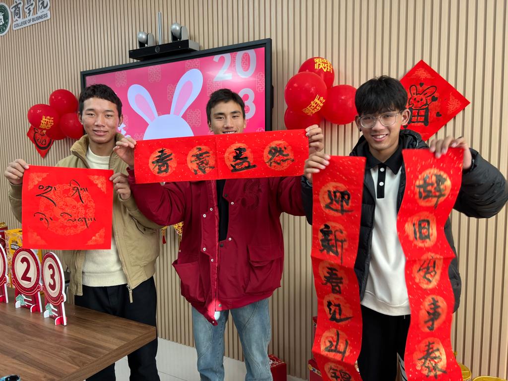 座谈会上,还通过视频连线的方式与营销202班旦增云丹远在西藏拉萨的母亲进行了家校联系。与会同学畅所欲言,对学院的悉心安排与迎春惊喜表示感谢,并围绕假期实习、学习、生活展开交流。来自西藏日喀则的物流22级学生格桑罗布表示,学院让他感受到家的温暖,今年将是一生中难忘的一个春节。这也是他没能和父母在一起度过的第一个春节。会后,与会老师与同学们一起写春联,送春节大礼包和防疫物资,整个活动现场洋溢着欢快、祥和的节日氛围。