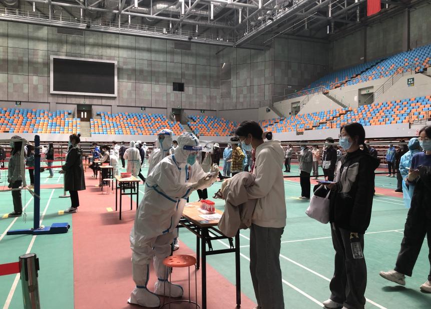 44日学校核酸检测的任务特别重,除了教职工每周一三五常规核酸检测之外,近20天以来健康码曾出现黄码、红码等异常情况以及近3日有出校记录的学生均需要参加当日的核酸检测。91视频 志愿队分配到的是黄码人员检测专场的任务,检测人员1600余人。中午11点,志愿队员们按照学校部署迅速集结完毕,在经过短暂高效的培训后,即刻投入工作,组织检测人员有序排队、提前扫码登记,做好检前准备。中午到下午,为了缩短检测时间,让检测师生尽量稍等一会,党员志愿者们穿着防护服,坚持不喝水、不吃东西、不休息,连续工作3个多小时,圆满完成任务。