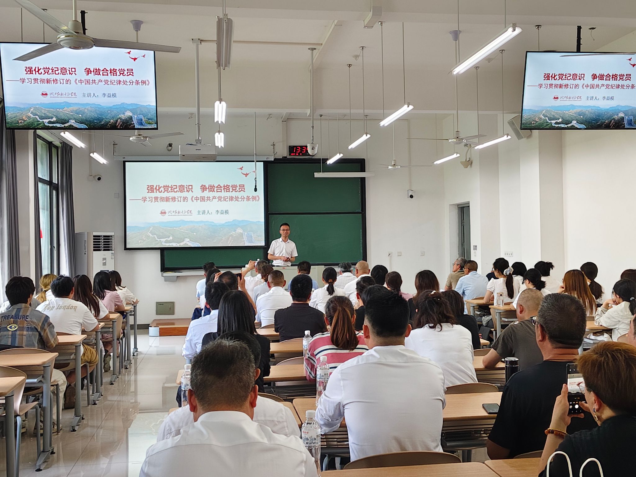 李益模围绕“强化党纪意识,争做合格党员——学习贯彻新修订的《中国共产党纪律处分条例》”的主题,从重要意义、主要内容、实践要求等三个方面开展授课。李益模详细分析了《条例》新旧内容对比,并结合违纪违法典型案例,重点对“六大纪律”内容进行了深入浅出的讲解,为大家上了一堂生动的党纪辅导课。最后,他提出了贯彻落实《条例》的四点实践要求,要守初心,坚定理想信念;要强党性,追求高尚情操;要担使命,践行为民宗旨;要知敬畏,遵章守纪自律。