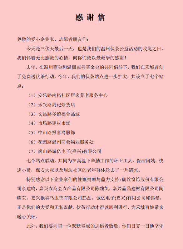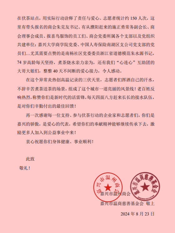 信中指出,在今年异常炎热创高温记录的三伏天里,志愿者们挥洒自己的汗水,不辞辛苦煮茶送茶的场景,组成了城市一道亮丽的风景线。老百姓们反响热烈,称赞是爱心的代表,是嘉兴的骄傲,是新时代的活雷锋。