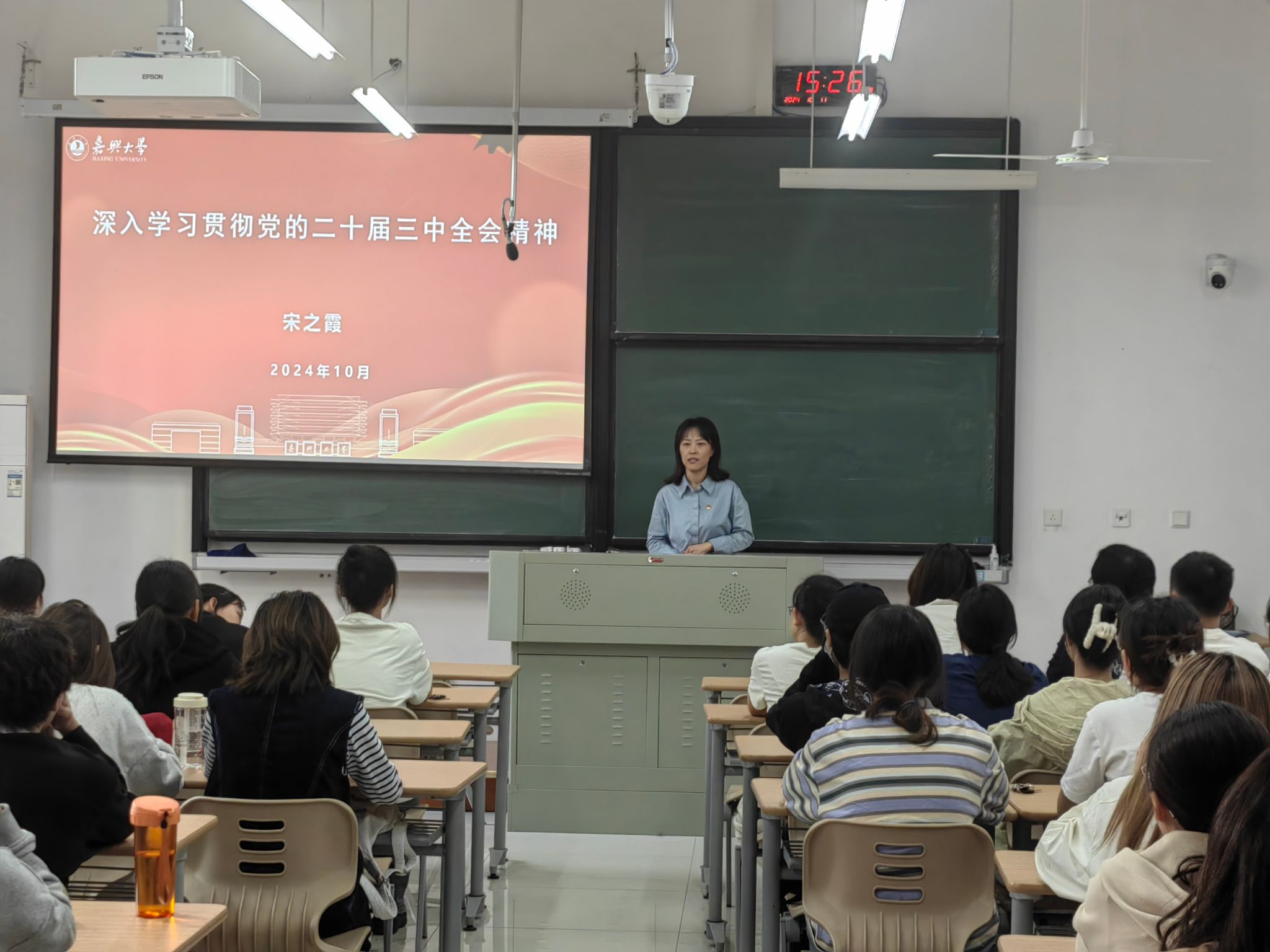 1010日下午,91视频 在厚德楼151举行学习贯彻党的二十届三中全会精神专题宣讲会。宣讲会由学校宣讲团成员、马克思主义学院党总支书记宋之霞主讲。91视频 党委副书记潘欣主持宣讲会。学生党员、团学骨干等学生代表90余人参与本次宣讲会。
