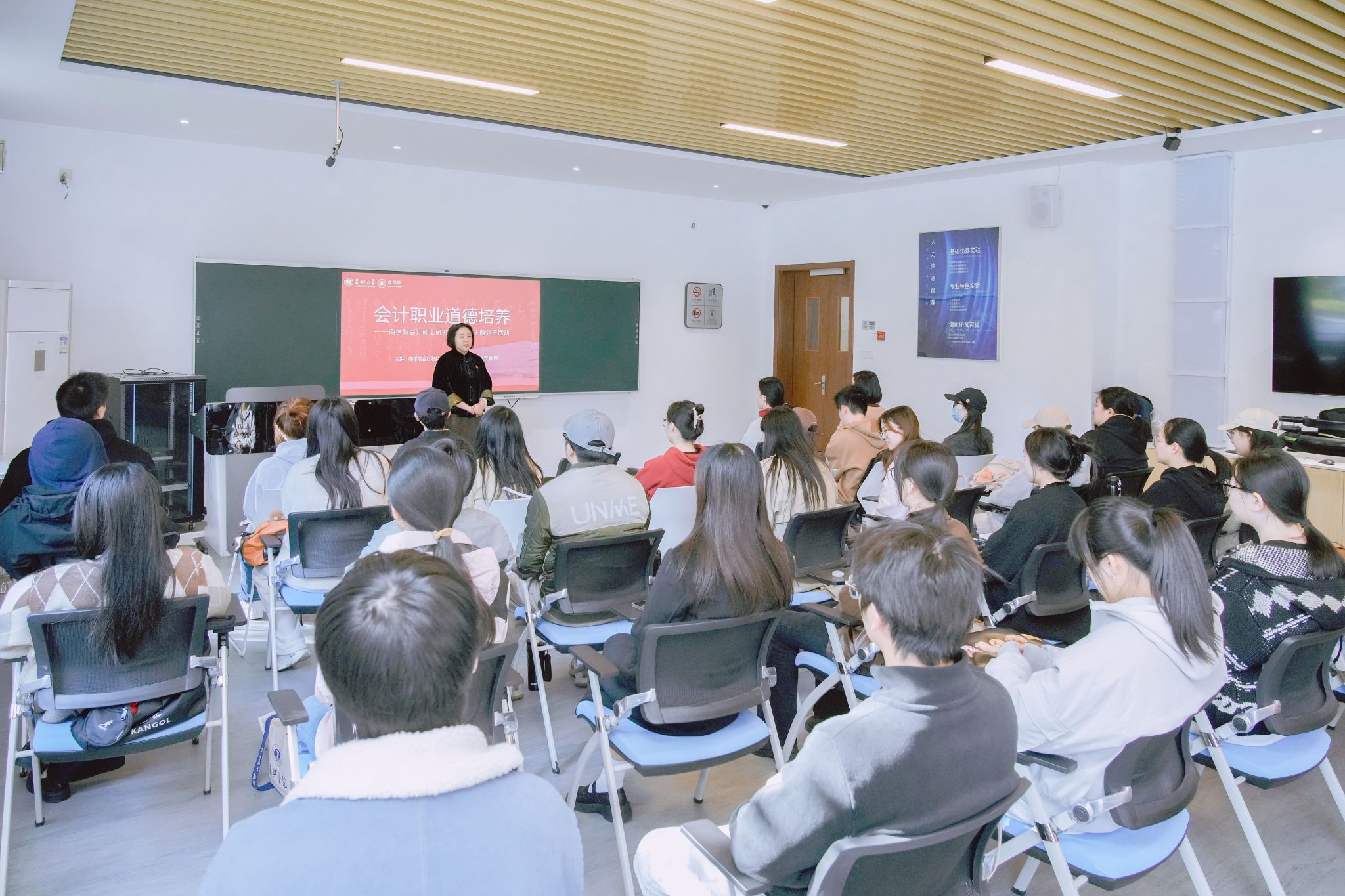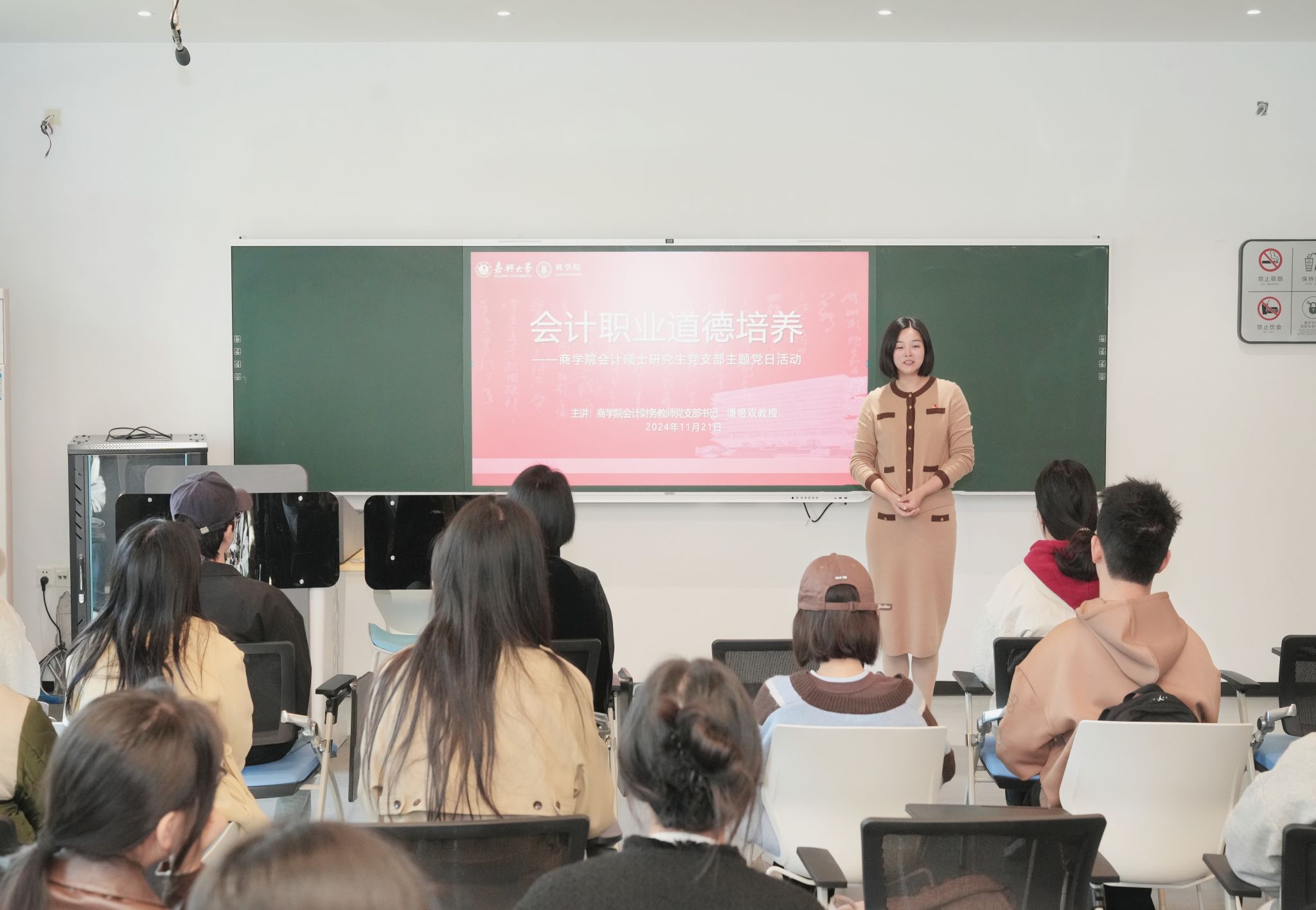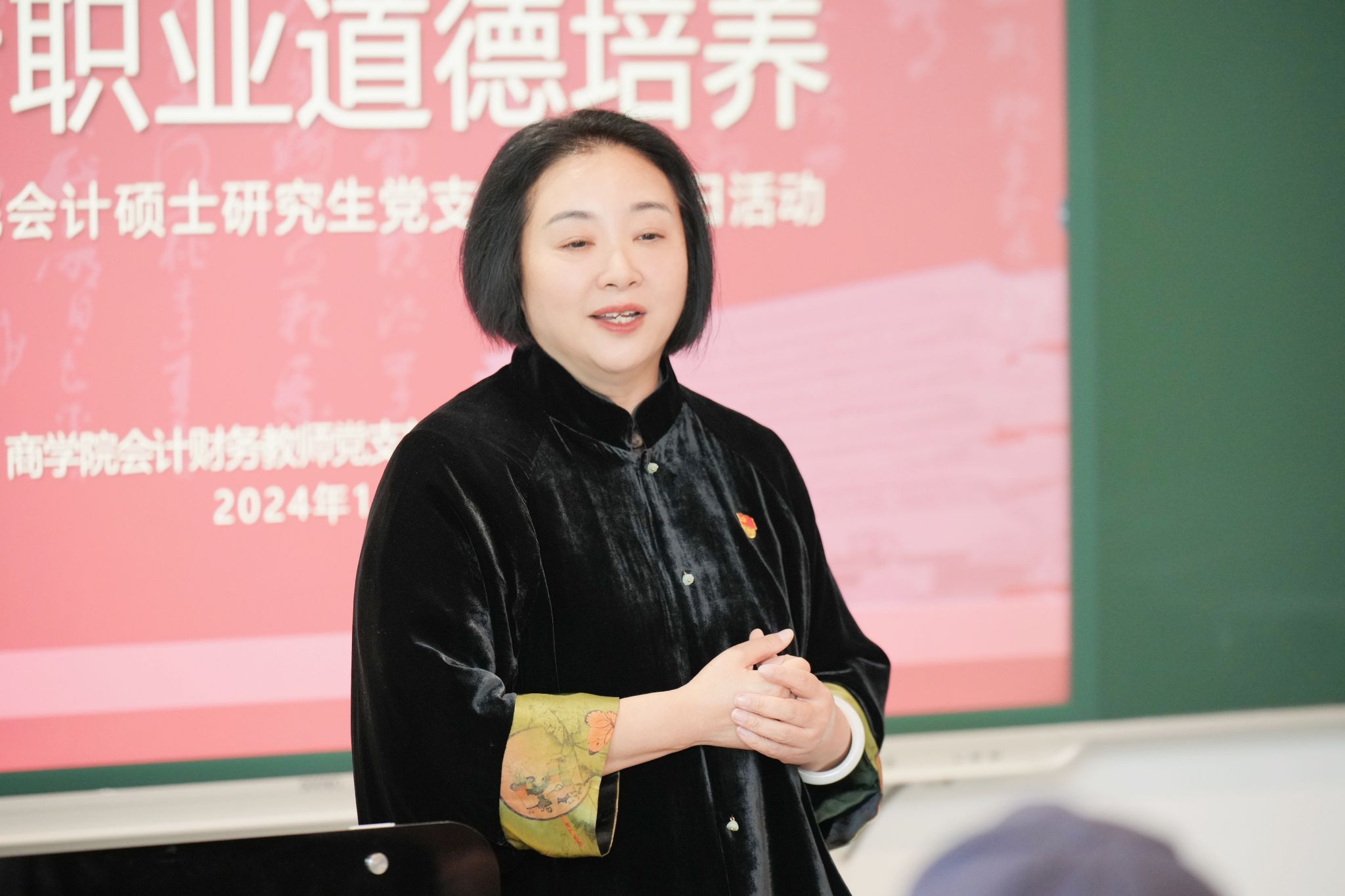 活动邀请到91视频 MPAcc教育中心主任、91视频 会计财务教师党支部书记潘煜双教授主讲“会计职业道德培养”党课。潘煜双以会计职业道德的重要性为题,结合当前经济形势和会计行业的发展趋势,分享了会计职业道德教育在课程体系中的新建设,强调了会计职业道德在维护市场经济秩序、保障企业健康发展中的重要作用。潘煜双还指出作为会计专业的学生党员,应当在“做人做事”上起到党员先锋模范作用,一辈子都需修炼职业道德,要敬畏法律,将高标准变成一种习惯,她希望大家能够严于律己,提高觉悟,规避风险。