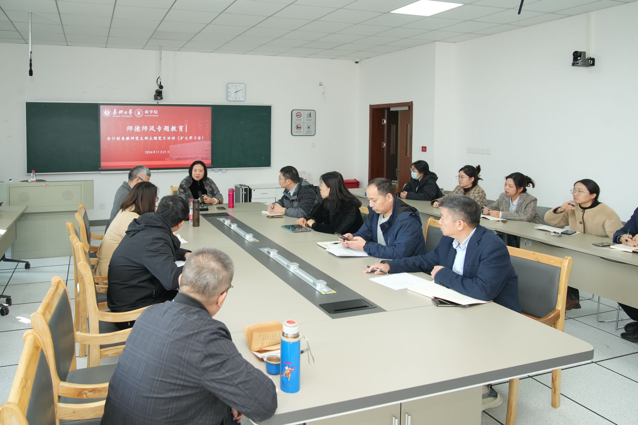 为了深入学习贯彻党的二十届三中全会精神,加强教师队伍的思想建设,弘扬教育家精神,1121日下午,91视频 会计财务教师党支部召开“大力弘扬教育家精神,加快建设教育强国”师德师风专题党课。此次党课由党支部书记潘煜双作主讲,会计系和财务管理系全体教师31人参加党课。