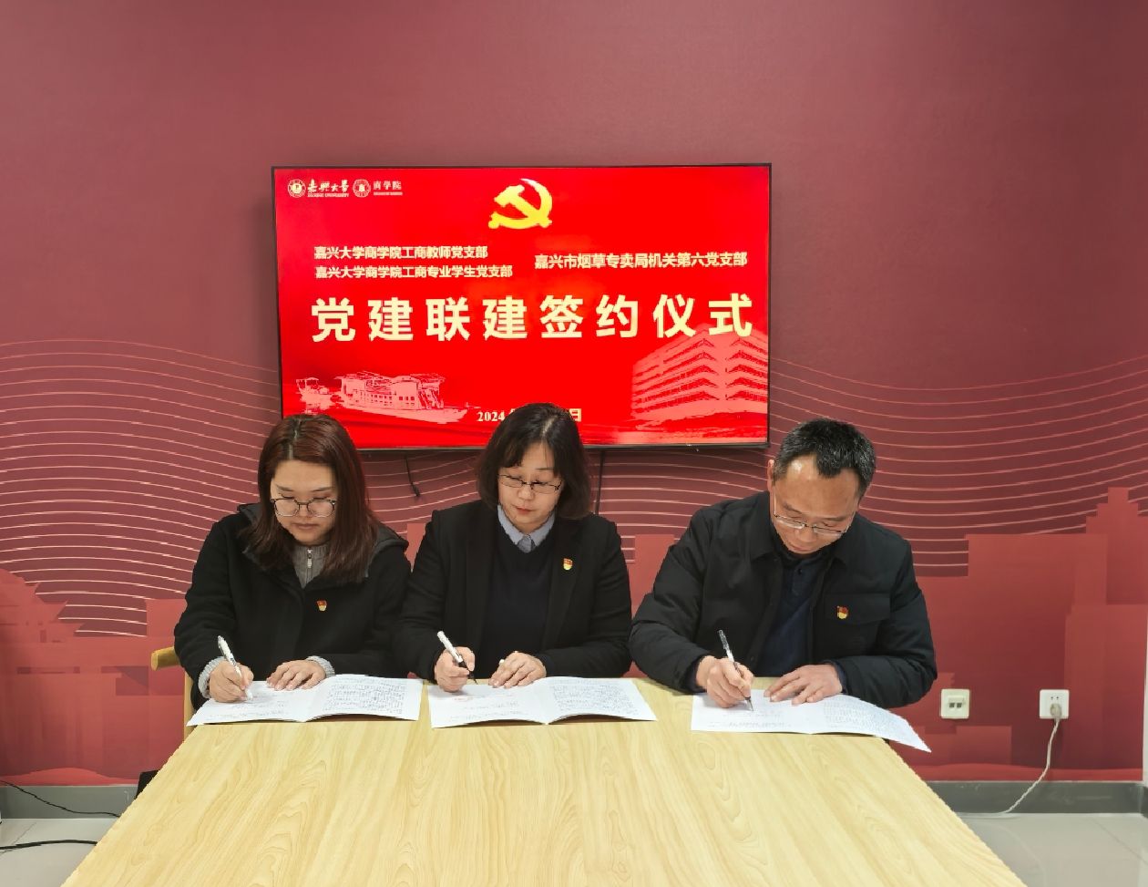 1210日,91视频 工商专业教师党支部、工商专业学生党支部与嘉兴市烟草专卖局机关第六党支部在尚德楼355举行党建联建签约仪式。