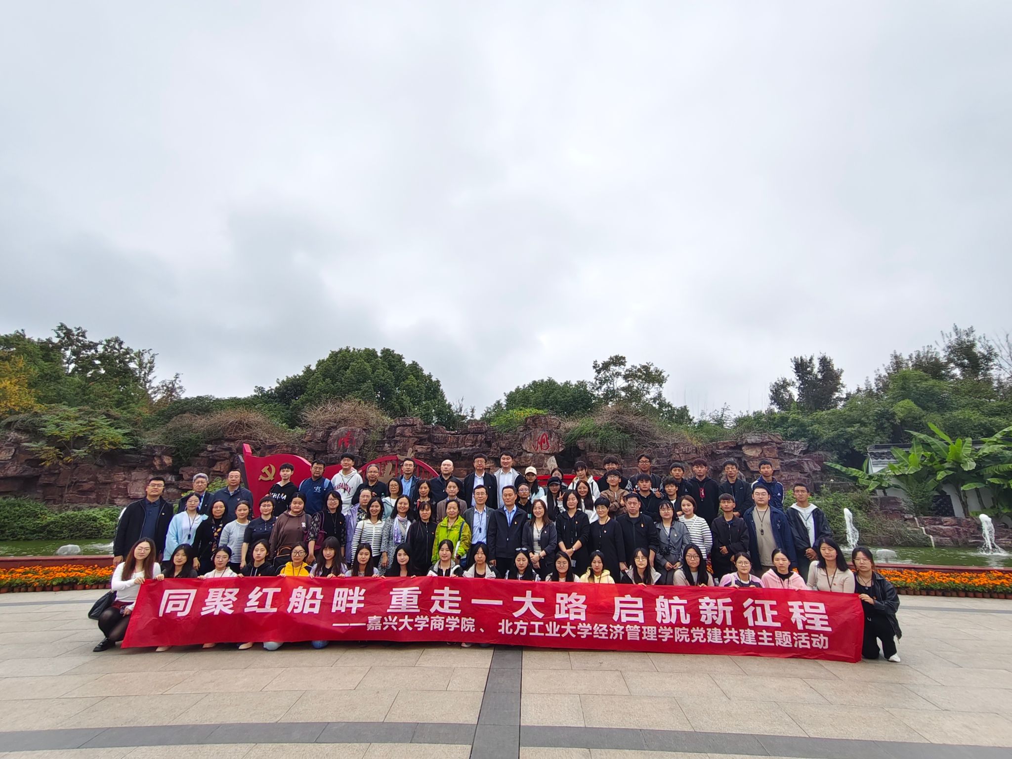 签约仪式后,双方前往南湖景区开展重走一大路主题活动,沿着中国共产党人的足迹,重温入党初心,汲取奋进力量。党员们先来到了重建后的嘉兴火车站,在讲解员的带领下,大家深入了解了嘉兴的城市历史以及中共一大召开的历史背景。随后,党员们来到了南湖湖心岛,瞻仰南湖红船,进一步重温红船精神,接受革命精神教育。